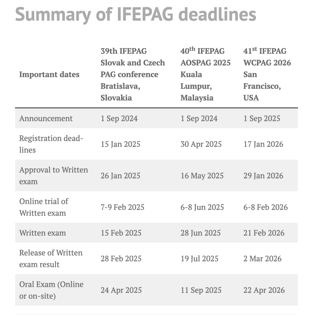 The coming IFEPAG examinations in 2025 and 2026 are shown in the table below.